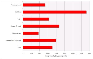 A real surprise here is light rail, which is about twice as energy intensive on average as cars and SUVs. However the average masks considerable variation between cities. Light rail in both San Diego and Portland, for example, consumes around 2,500 Btu/passenger mile whereas there are four systems (North Little Rock, Memphis, Kenosha, Galveston) that use more than 10,000. Galveston burns up a whopping 30,000 Btu’s for each passenger mile.