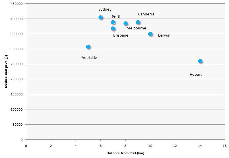 The data on units shown in Figure 2 runs in the other direction. The median unit is closer to the CBD in Sydney than it is in Melbourne. I’ll speculate that this is a because of the high concentration of units in premium locations in inner Sydney, especially around the harbour and CBD.