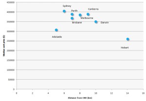 Figure 1 shows that a buyer has to travel 23 km from the CBD in Sydney in order to obtain a house at the median price of $500,000. However in Melbourne the median house costs considerably less – $430,000 – and, more importantly, you only have to go 12 km out to find it. All this even though the population difference is only around 500,000 people – 4 million in Melbourne vs 4.5 million in Sydney.