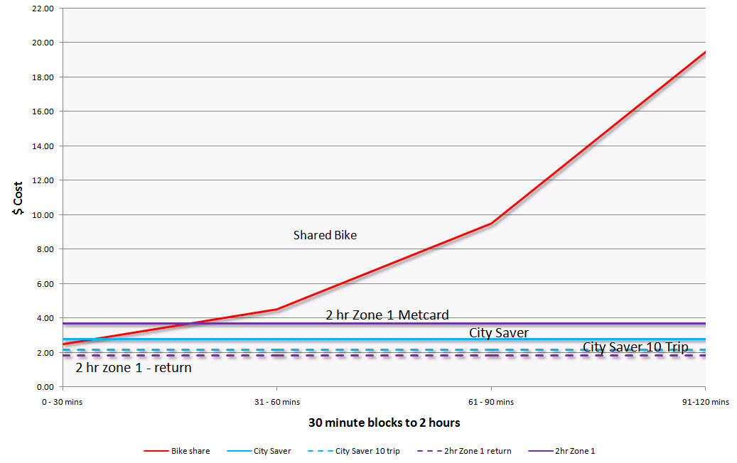 The accompanying graph shows the cumulative cost of the choices facing the casual user for a two hour trip. He or she faces a $2.50 flag fall for the first 30 minutes, which is marginally cheaper than a $2.70 City Saver fare but more than the $2.18 cost of a 10 trip City Saver. However a 2 hour zone 1 Metcard costs $3.70 and covers both the forward and return journeys. Two hours travel with Melbourne Bike Share costs $19.50.