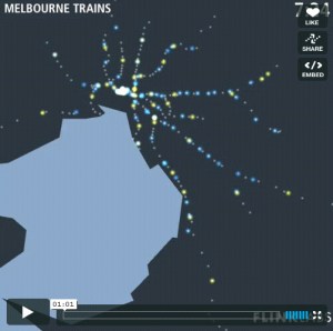 Posted: July 8, 2010 Filed under: Public transport | Tags: App My State, data visualisation, Flink Labs 4 CommentsThis outstanding satellite-like view of Melbourne’s trains running over the course of a day was developed about twelve months ago by Flink Labs, a new Melbourne data visualisation firm. In their words: