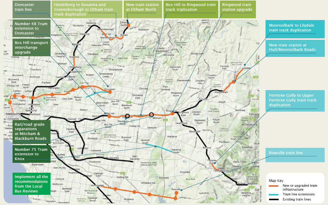 In my last post about the Green’s election manifesto, a Public transport plan for Melbourne’s east, I indicated I would take a closer look at the two new rail lines the party is proposing to finance – a line to Rowville and a line to Doncaster – with its nonexistent $6 billion.