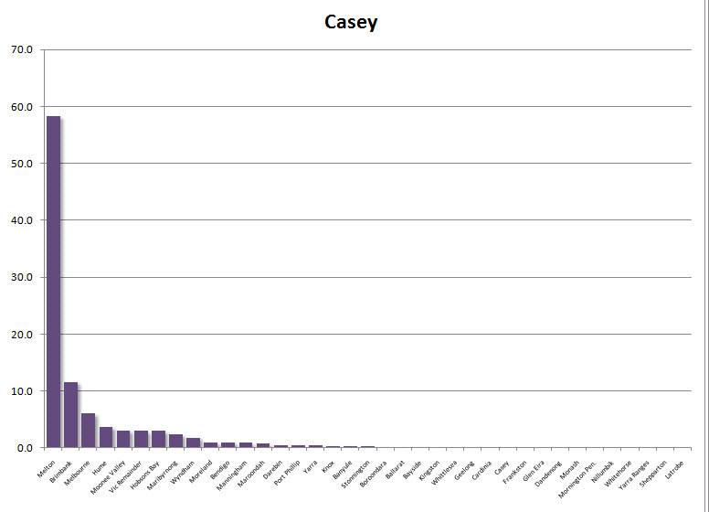 While another 8% of trips by Monash residents are to the city centre, the corresponding figure is less for far-flung municipalities – just 4% for Casey and less than 1% for Cardinia (see more charts below).