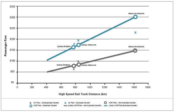 Comparison of air fares and HSR fares used in the patronage demand forecasting modelling (one-way). NOTE: The clue to understanding this graph is the blue curve is business fares and the grey one is non-business fares