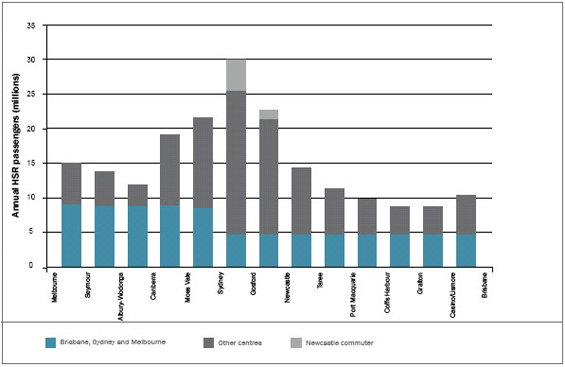 Now I want to start exploring some issues the report raises. One of those is that, up to this point, the focus of the HSR discussion has largely been around travel between major cities, especially Sydney-Canberra-Melbourne, with some residual claims for regional development (see Categories in the side pane for previous posts on HSR).