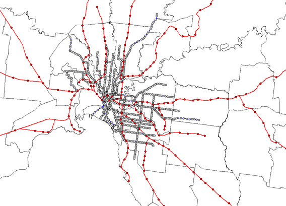 Compared to the tram system, the train network is relatively sparse, particularly in the middle and outer suburbs where not only the distance between the radial lines increases as a function of simple geometry, but the distance between stations also increases. The distance from Narre Warren station to Berwick station, for example, is over 4 km – the 400 metre walk radius assumed by DoT accordingly misses much more than it picks up.