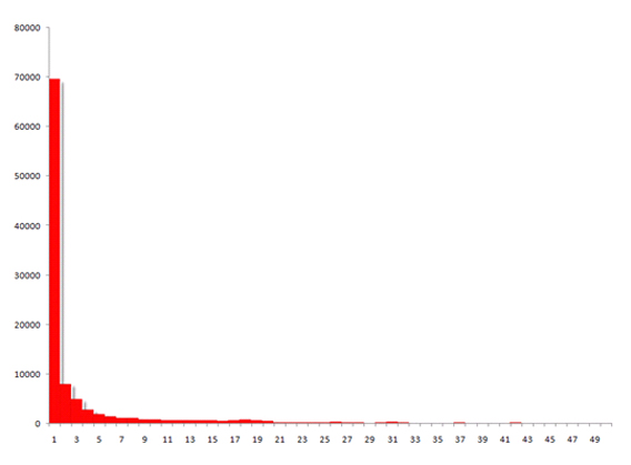 I’ve taken these plots from Steven Pinker’s new book, The better angels of our nature: why violence has declined. It’s in a Chapter titled The statistics of deadly quarrels where he discusses the statistical patterning of wars and takes a small detour into “a paradox of utility”, specifically our tendency to see randomness as regularity with little clustering.
