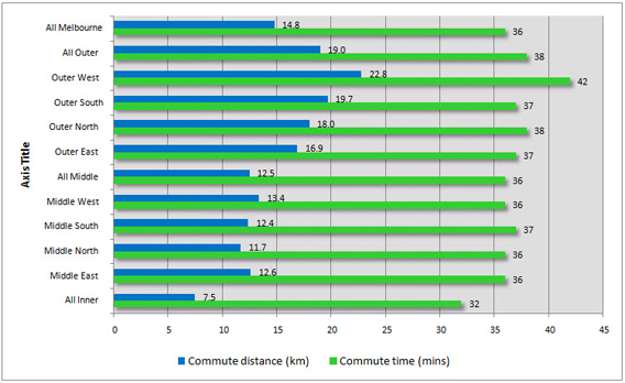 Since fewer than 10% of Melbourne’s workers live in the inner city (approx 5 km radius around the Melbourne Town Hall), what’s more pertinent is the average commute times of the more than 90% who live in the middle and outer suburbs. Their commutes don’t vary much – the average middle ring worker commutes for 36 minutes, the average outer suburban worker for 38 minutes. That’s just 5% more.