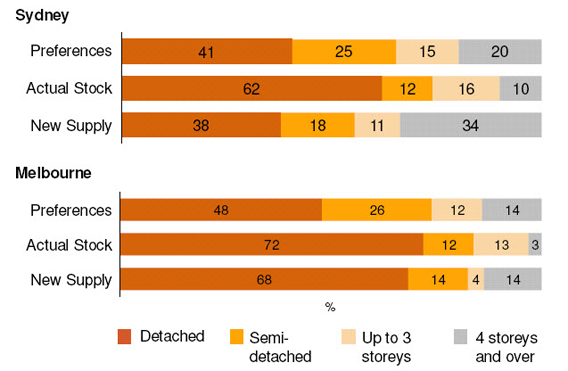 Housing preferences compared with existing stock and the composition of current housing supply (by Grattan Institute)