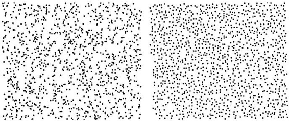 The one on the left, with the clumps, strands, voids, and filaments (and perhaps, depending on your obsessions, animals, nudes, or Virgin Marys) is the array that was plotted at random, like stars. The one on the right, which seems to be haphazard, is the array whose positions were nudged apart, like glowworms