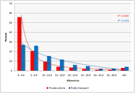 It’s evident from the exhibit non-workcar trips are substantially shorter – just compare the two fitted curves. In fact 56% are less than 5 km, whereas the corresponding figure for public transport is 27%. At the other end of the scale, 5% of non-work car trips are longer than 30 km, compared to 9% of public transport trips.