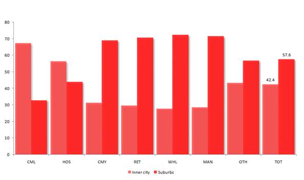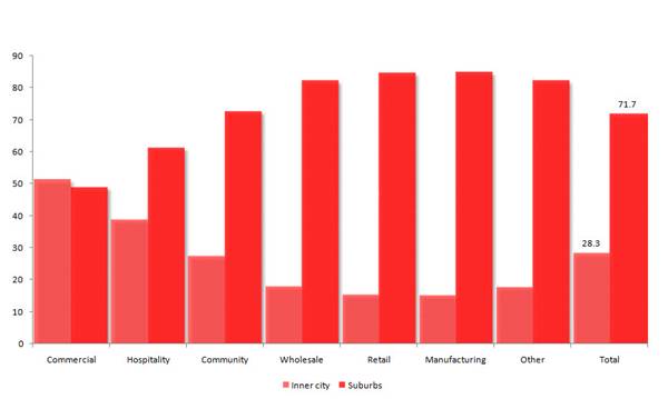 Those in the suburbs however tend to service the resident population – they are firms like real estate agents and personal financial advisers. The net result is the industry composition of the suburbs and the inner city are quite different. While they have much the same proportions of Community Services jobs, the suburbs have a significantly higher proportion of Manufacturing & Transport and Retail jobs. The inner city, on the other hand, is dominated by the Commercial Services sector – it accounts for nearly half of all jobs.