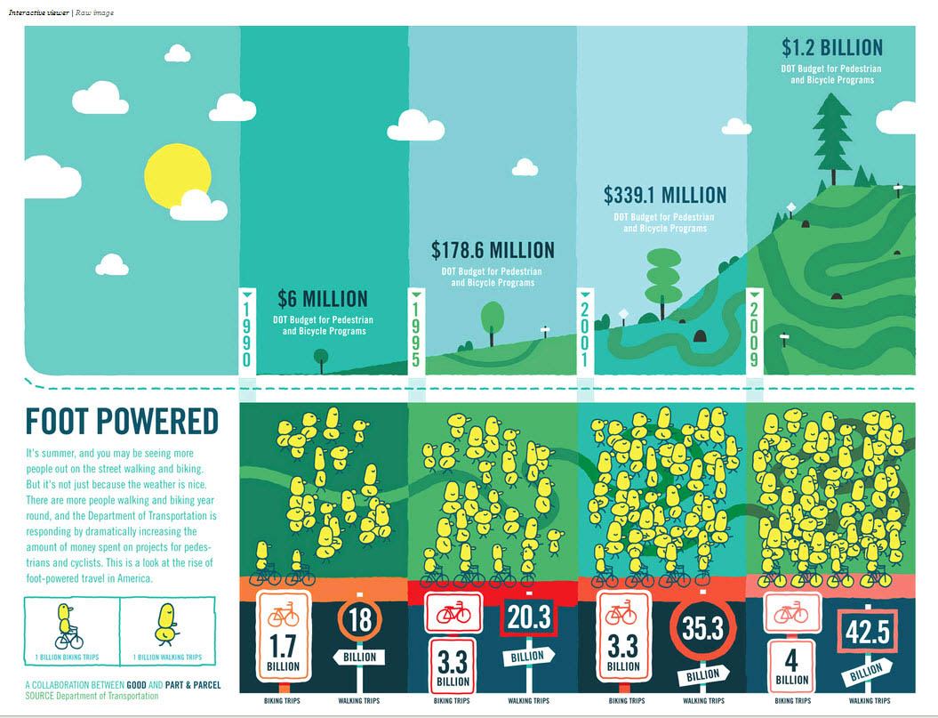 Posted: July 4, 2010 Filed under: Cycling | Tags: biking, Cycling, GOOD, Ray LaHood, US Department of Transportation, walking Leave a commentThis graphic is from GOOD and is titled The Rise of Walking and Biking (click to enlarge). The supporting text says “You may be seeing more people out on the street walking and biking. But it’s not just because the weather is nice. There are more people walking and biking year round, and the Department of Transportation is responding by dramatically increasing the amount of money spent on projects for pedestrians and cyclists”.