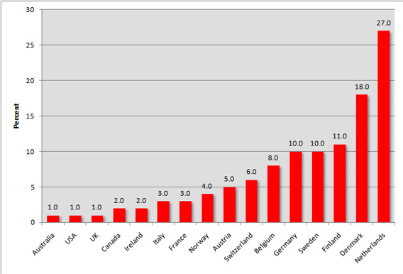 There’s no doubt bicycle use in Australia is indeed low compared to some other countries. For example, according to Pucher and Buehler in Making cycling irresistible: lessons from the Netherlands, Denmark and Germany, bicycles capture 27% of all trips in the Netherlands and 18% in Denmark, but a mere 1% in Australia (see exhibit). And there’s no doubt helmets aren’t considered important in these countries – in the Netherlands, for example, less than 1% of adults and only 3-5% of children choose to wear a helmet when cycling.