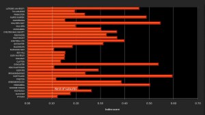 Specialisation Index scores for suburban centres. 13 centres score 0.3 or higher. Dotted line shows score for suburban jobs located outside centres (click to enlarge)