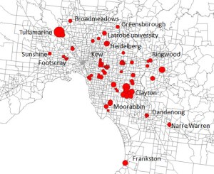Some centres like Burwood East, Sunshine and Broadmeadows are specialised in three industries. The only truly “diversified” centre is Kew/Hawthorne, whose sectoral composition is reasonably similar to that of the rest of the suburbs in all industries (note that larger centres tend to have fewer specialisations because there is less variability). Read the rest of this entry »