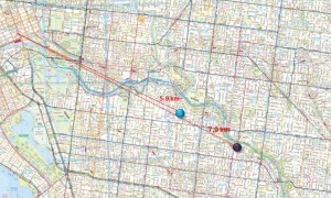 The centre of gravity is calculated by dividing Melbourne up into 1,000 traffic zones and weighting the coordinates of the centroid of each zone by the number of jobs it holds. If you imagine a relief model of employment in Melbourne, the centre of gravity is where you’d rest the model on a needle so that it balancess perfectly.