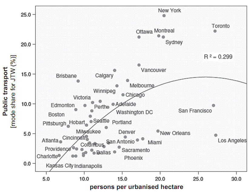 It is taken from the same article that I mentioned in my last post. The authors, Dr John Stone and Dr Paul Mees, find there is only a modest relationship between population density and transit share (R2 = 0.229). They conclude that “higher density across the whole urban region is not the explanatory variable that many might expect”.