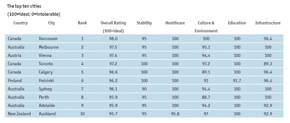 As I’ve pointed out before, these sorts of surveys shouldn’t be taken seriously as a guide to how liveable our cities really are. They have a number of shortcomings. Read the rest of this entry »