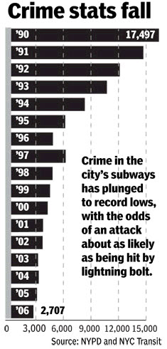 An initial observation is that 33 offences per million boardings is actually not that good. For example, crime is much lower on the New York City subway (see chart -shows absolute numbers), which carries ten million passengers on an average work day. The Boston rail system carries 350 million passengers per year with only 2.2 crimes per million boardings.