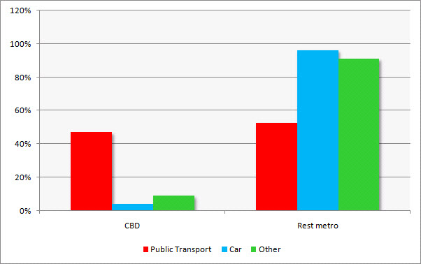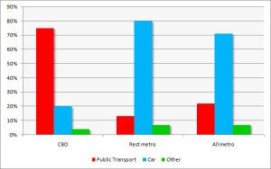 When the CBD and the rest of the metropolitan area are taken together, the mode split for commuting for all of Sydney is 22% for public transport and 71% for car. Despite its high public transport share, the CBD has a small effect on the Sydney-wide average because it only has a small proportion of all jobs in Sydney – it accounts for just 14% of total work journeys.